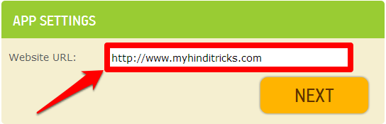 Website button par click karne ke bad aap dekhiye or ek naya page khulega jiss option ke naam hai App Settings uss option se aap Website URL box par apne blog ya website ke URL add kare. Uske baad aap Click here to see preview par click karke check karle sab thik hai ya nehi uske bad NEXT button par click kare.