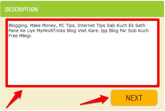 Upar next par click karne ke bad ek naya page khule ga udhar aap ko aapne site ke "DESCRIPTION" dena hoga dekhiye ek blank box hai udhar aap apne site ke kuch DESCRIPTION likhiye, uss ke bad NEXT button par click kare.