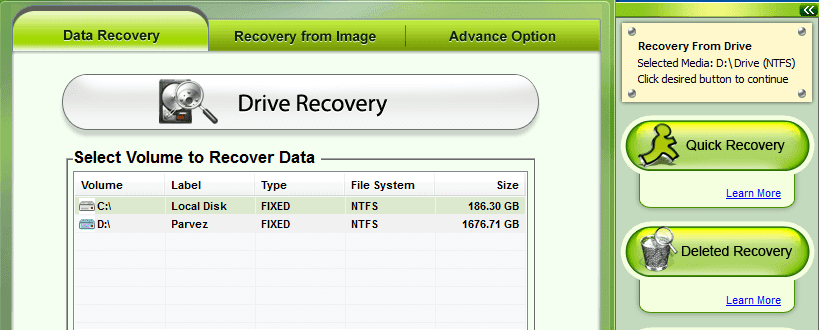 Step 3. Aagar aap drive recovery karna cahati ho to Data Recovery par click karke aapna drive select kare.