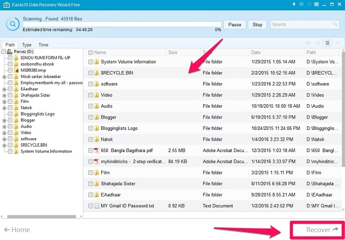Step 6. Aabhi dekhiye aapka sab file scan hoga uske bad deleted file show hoga usko select karke Recovery button par click kare.